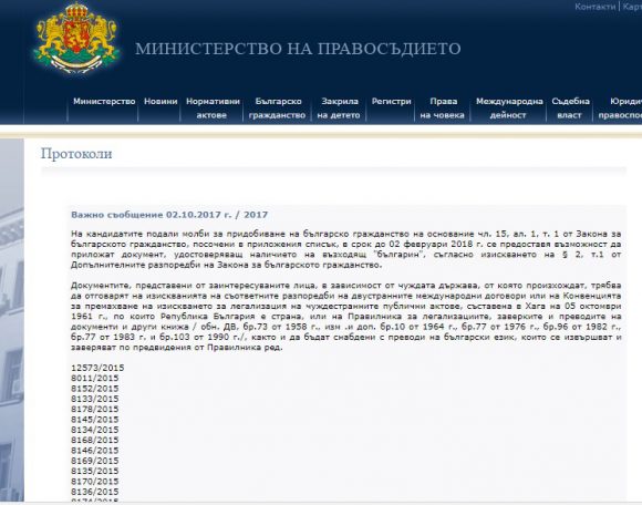 И още нещо важно: Протоколите с издадените укази за придобиване или отказ на българско гражданство за този период не са публикувани на сайта на Министерството на правосъдието, каквато практика е имало преди 22.01.2017 г. Вместо това, на 2.10.2017 г. е публикувано „Важно съобщение“, което съдържа входящите номера на стотици податели на молби за придобиване на българско гражданство от 2015-та и 2016-та г. Оставена им е възможност до 2.02.2018 г. да доставят документ за наличието на „възходящ българин“.