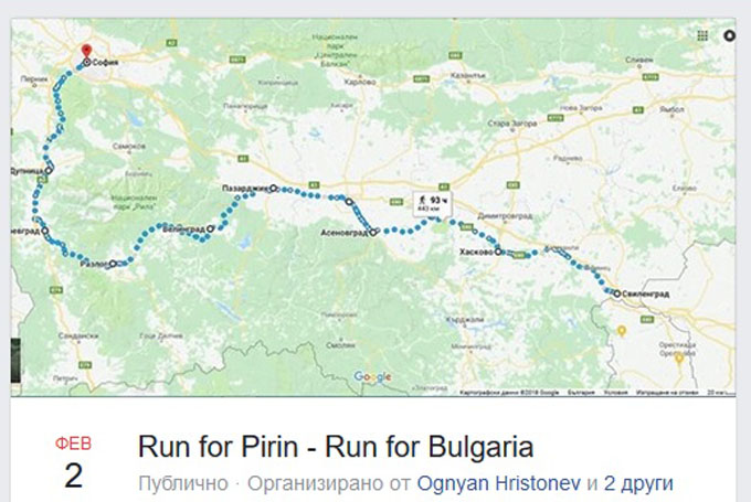 От 2 до 8 февруари 2018 г. бегачи от различни български градове ще тичат щафета от Свиленград до София, като форма на протест срещу отварянето за застрояване на Национален парк Пирин. Те ще изтичат над 440 км от Свиленград до София, минавайки през 10 от протестиращите градове.