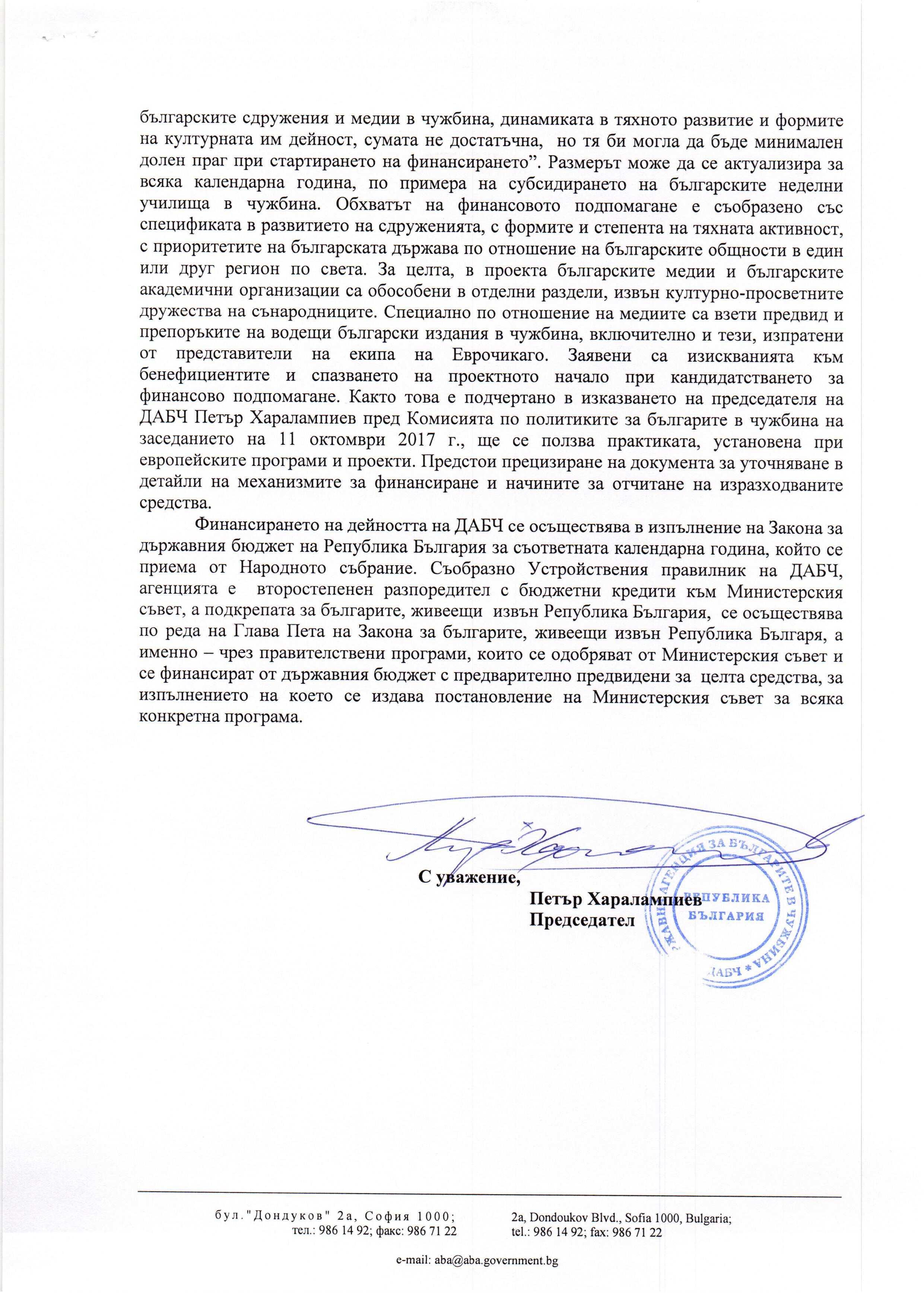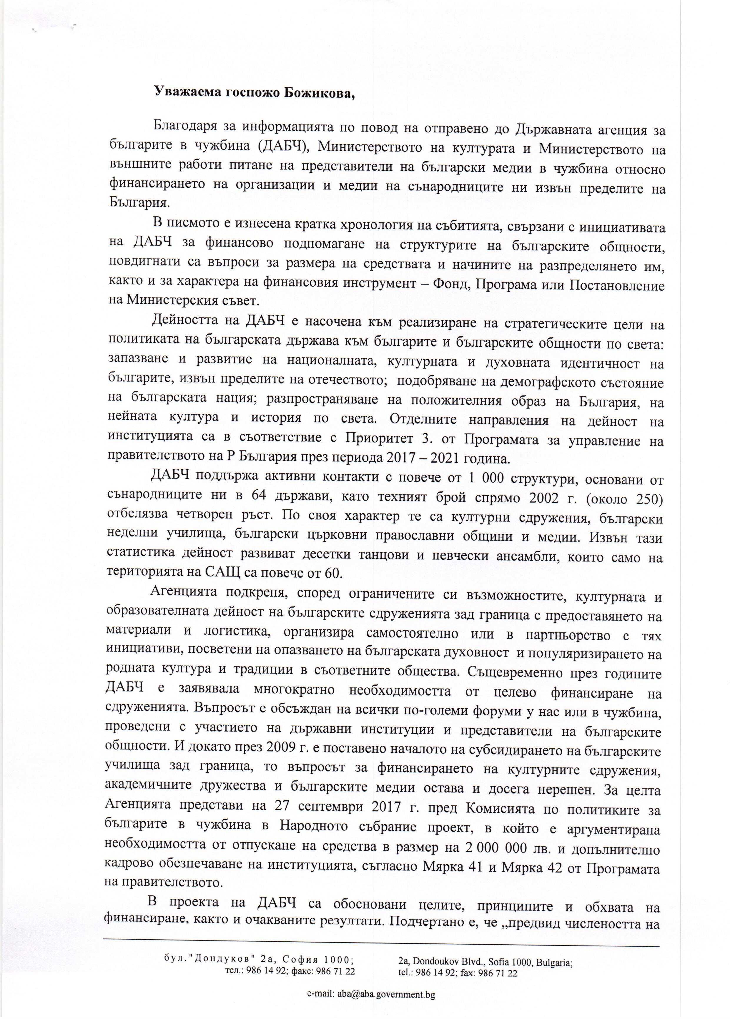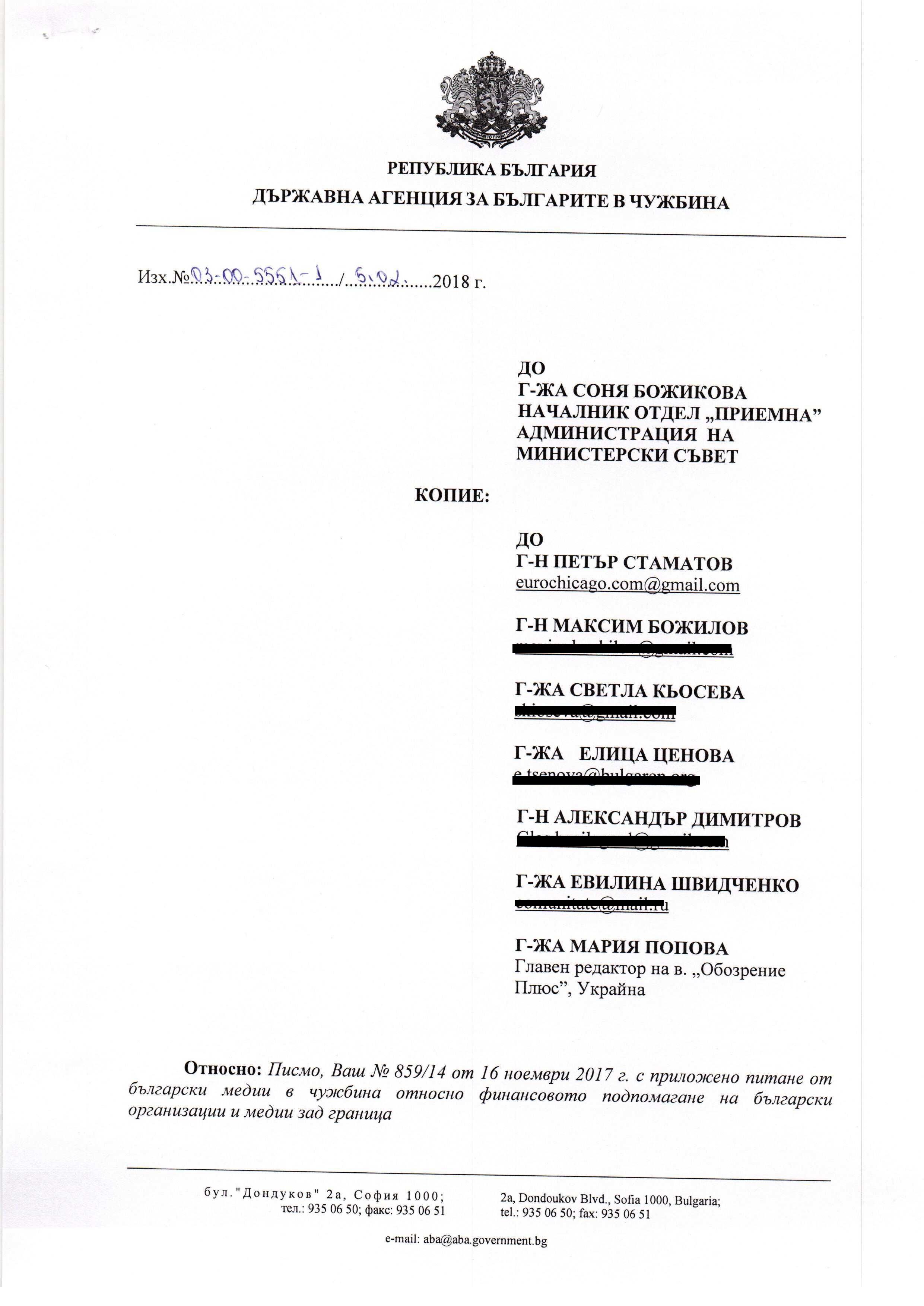 Благодарим все пак за този отговор на Агенцията, който е с обръщение до началника на отдел „Приемна“ на МС Соня Божикова, но е изпратен и до авторите на писмото от м. ноември 2017 г. – издателя на EuroChicago.com Петър Стаматов (Чикаго, САЩ), издателя на в. „Български хоризонти“ Максим Божилов (Торонто, Канада), Светла Кьосева, главен редактор на сп. „Хемус“ (Унгария), Елица Ценова, редактор на Melange Bulgaren (Виена, Австрия), Александър Димитров, ГЛАС ПРЕС (Босилеград, Сърбия), Евилина Швидченко, редактор и водещ на ТВ предаване “На Буджакска вълна” (Кишинев, Молдова) и Мария Попова, главен редактор на в. „Обозрение плюс“ (Украйна).