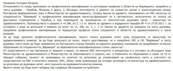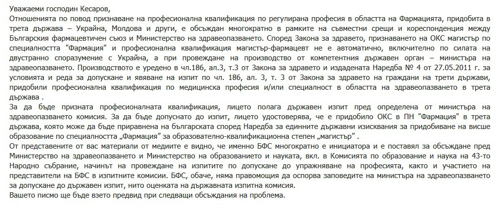 Отношенията по повод признаване на професионална квалификация по регулирана професия в областта на Фармацията, придобита в трета държава – Украйна, Молдова и други, е обсъждан многократно в рамките на съвместни срещи и кореспонденция между Българския фармацевтичен съюз и Министерство на здравеопазването. Според Закона за здравето, признаването на ОКС магистър по специалността „Фармация“ и професионална квалификация магистър-фармацевт не е автоматично, включително по силата на двустранно споразумение с Украйна, а при провеждане на производство от компетентния държавен орган – министъра на здравеопазването. Производството е уредено в чл.186, ал.3, т.3 от Закона за здравето и издадената Наредба № 4 от 27.05.2011 г. за условията и реда за допускане и явяване на изпит по чл. 186, ал. 3, т. 3 от Закона за здравето на граждани на трети държави, придобили професионална квалификация по медицинска професия и/или специалност в областта на здравеопазването в трета държава.