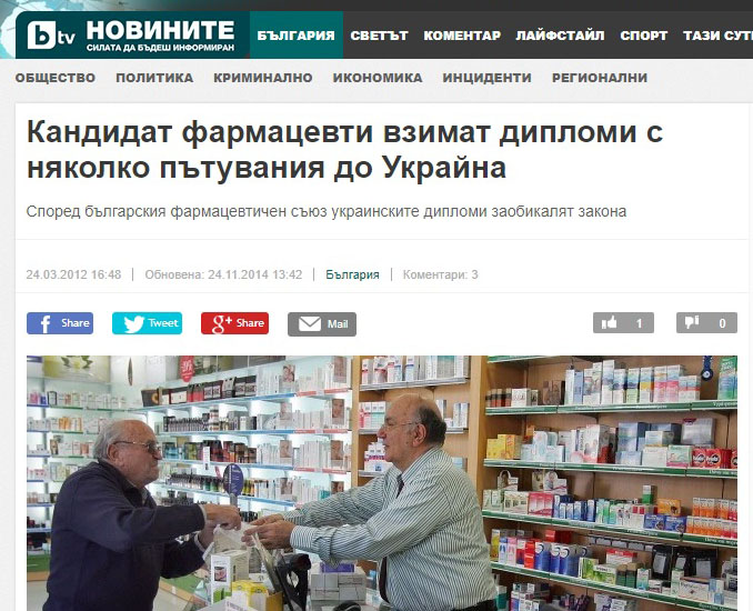 Към нашето издание се обърна Иван Кесаров, който е обезпокоен от проблема с получаването и узаконяването на фармацевтични дипломи, взети от български студенти в Украйна чрез на практика задочна форма на обучение, което за тази специалност в България е забранено – законна е само редовната форма на обучение. За проблема с т.нар. дипломен туризъм в Украйна е ставало дума в предавания на bTV още през 2010 г., както и през 2012-та. В тях се казва, че кандидат-фармацевти взимат дипломи само с няколко пътувания до Украйна, и са излъчени интервюта с представители на Българския фармацевтичен съюз, според които законът се заобикаля и квалификацията на завършилите в Украйна е под голям въпрос. Става ясно, че още преди години този проблем е съществувал, но изглежда не е решен и до днес.