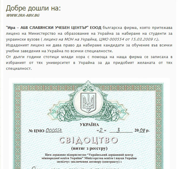 Бел.ред.: В сайта на фирмата „Ира – АБВ СЛАВЯНСКИ УЧЕБЕН ЦЕНТЪР„, за която споменава г-н Кесаров, пише, че тя е е единствената фирма, която има лиценз от украинското Министерство на образованието на набиране на студенти в украински вузове. Българските студенти се интересуват, според както пише в сайта на фирмата, от образование в Украйна най-вече по специалностите Медицина, Стоматология, Фармация, Ветеринарна медицина и др. Само за Фармацията е уточнено, обаче, че за нея има интерес за образование редовно – което е малко странно, защото и за специалности като Медицина, Стоматология и пр. адекватната форма е редовното обучение, не задочното.