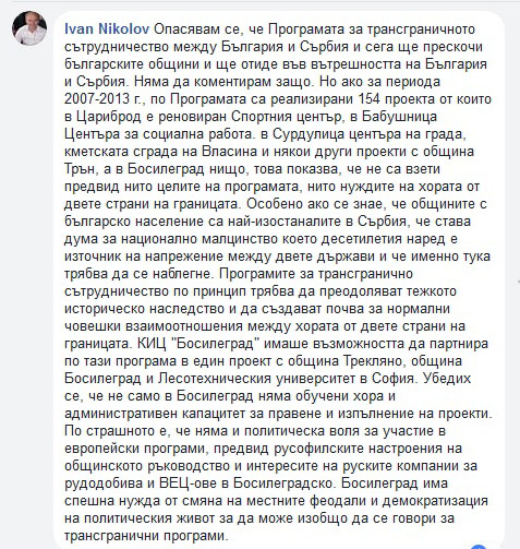 И още по темата – един коментар в социалната мрежа Фейсбук – на председателя на Културния-информационния център „Босилеград“ Иван Николов: