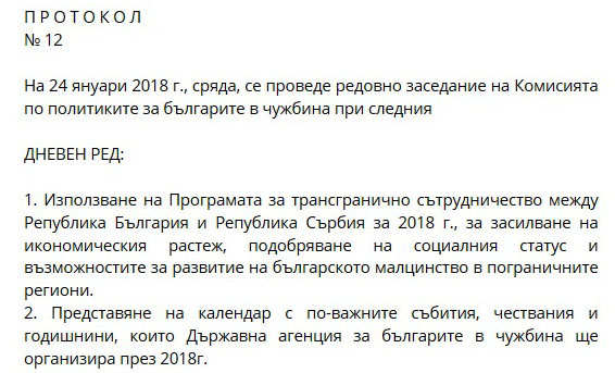 По време на това заседание Маргарита Джоганова, началник отдел „Програми за трансгранично сътрудничество по инструментариума за предприсъединителна помощ“ в дирекция „Управление на териториалното сътрудничество“ в МРРБ, бе питана от депутати – членове на Комисията какви конкретни проекти са били осъществени по тази програма в общини в района на Царибродско, Димитровградско и Босилеградско, където живее компактно българско население и се разбра в крайна сметка, че досега ефектът от тази програма за общните в Р. Сърбия, в които живее компактно българско население, е бил твърде минимален. На заседанието присъстваше като гост и Саша Златанов, българин от община Бабушница.
