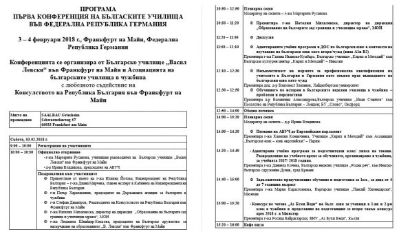 На 3-ти и 4-ти февруари във Франкфурт на Майн се проведе Първата конференция на българските училища в Германия. Конференцията бе организирана от Българското училище „Васил Левски“ във Франкфурт на Майн и Асоциацията на българските училища в чужбина, с любезното съдействие на Консулството на Р. България във Франкфурт.