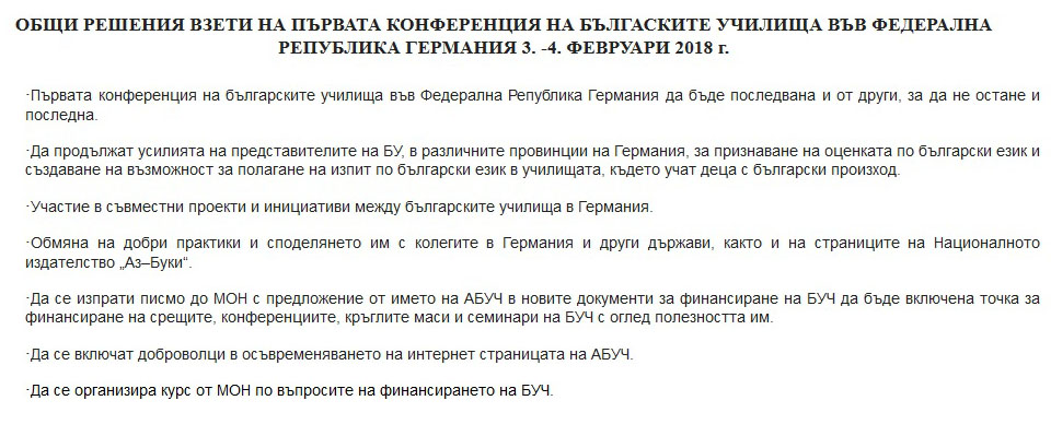 – Да продължат усилията на представителите на БУ, в различните провинции на Германия, за признаване на оценката по български език и създаване на възможност за полагане на изпит по български език в училищата, където учат деца с български произход.