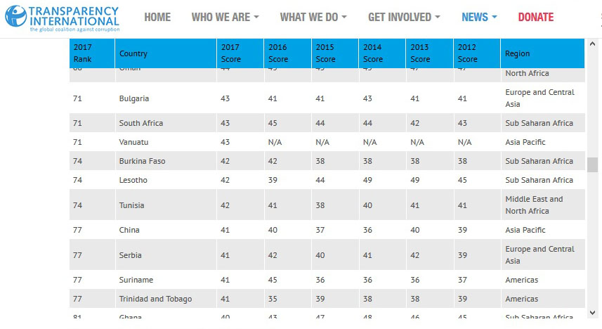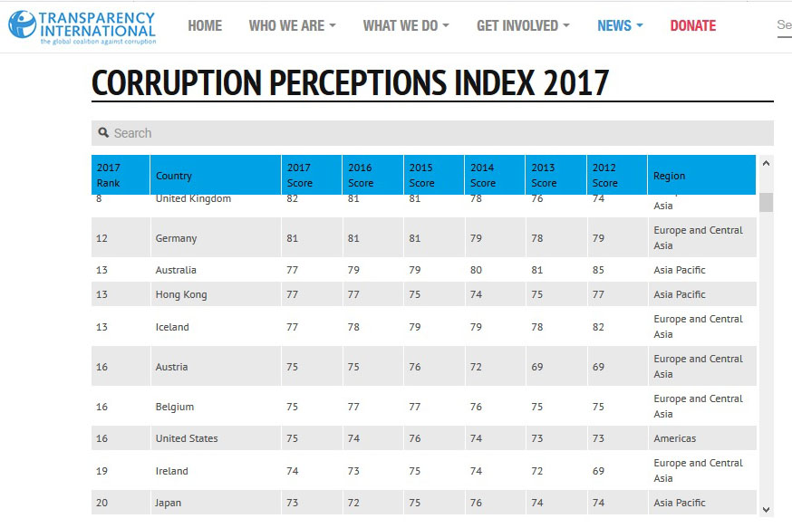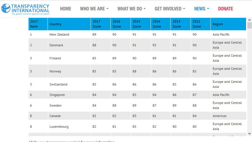Излезе годишната класация на „Трансперънси интернешънъл“ за корупцията по света.