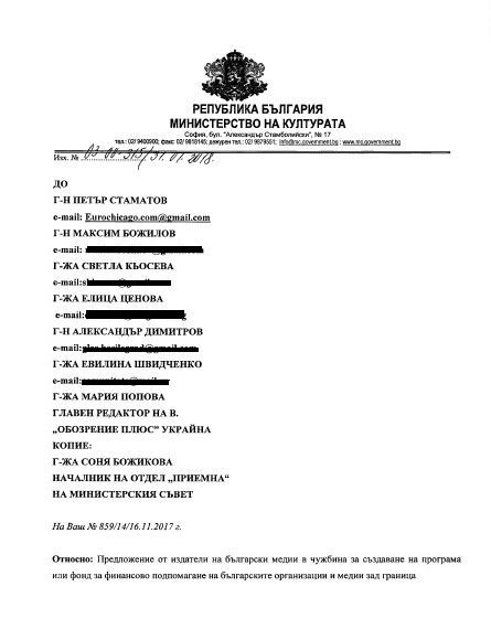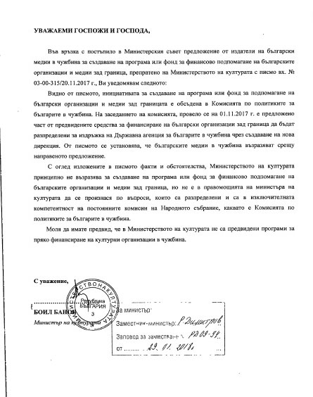 На 31 януари 2018 г. Министерството на културата на Р. България изпрати отговор на писмо, изпратено от български медии зад граница на 14 ноември 2018 г. до български институции и препратено на 15 ноември 2017 г. от Администрацията на Министерски съвет до Министерството на културата и Министерството на външните работи.