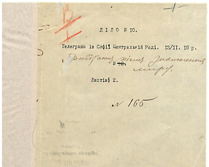 На 13 февруари 1918 г. председателят на Народното събрание на Царство България Димитър Вачов изпраща телеграма до украинската Централна рада (съвет), с поздравления за сключения мир. Това се случва скоро след като в Брест-Литовск е сключен мирният договор между Четворния съюз (Германия, Австро-Унгария, България и Османската империя), от една страна, и Русия, от друга страна, който слага край на руското участие в Първата световна война.