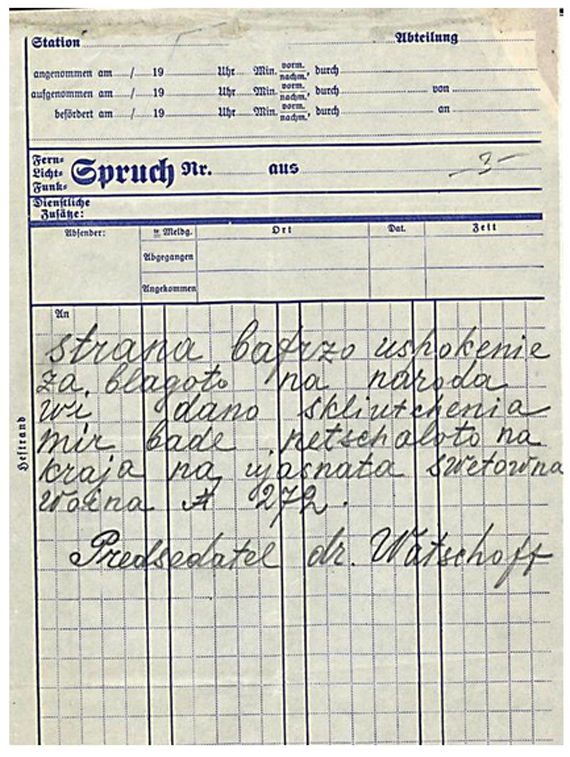 Телеграмата се съхранява в Централния държавен архив на висшите органи на властта и управлението на Украйна (ЦДИАО на Украйна. F. 1063. Op. 3. Sp. 15. Arch. 1-3). Информация за нея ни бе изпратена от г-жа Соня Димитрова-Мартинюк. Оригиналният текст на документа е на български, написан на латиница.
