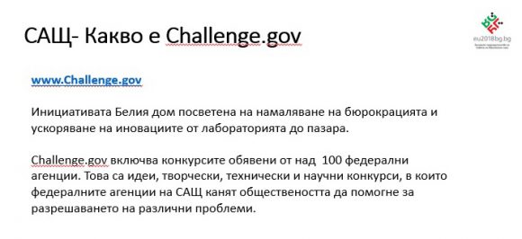 Презентацията засягаше и Challenge.gov – инициатива на Белия дом за намаляване на бюрокрацията и ускоряване на иновациите, която включва конкурси, обявени от над сто федерални агенции.