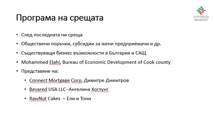 На срещата на българския бизнес бе представена и информация за инициативи на Окръг Кук за стимулиране на икономическото развитие и растежа на работните места – устойчиви инвестиции в общността, растеж на бизнеса, привличане и задържане на работници и служители, жилища на достъпни цени, регионално планиране, развитие на работната сила.