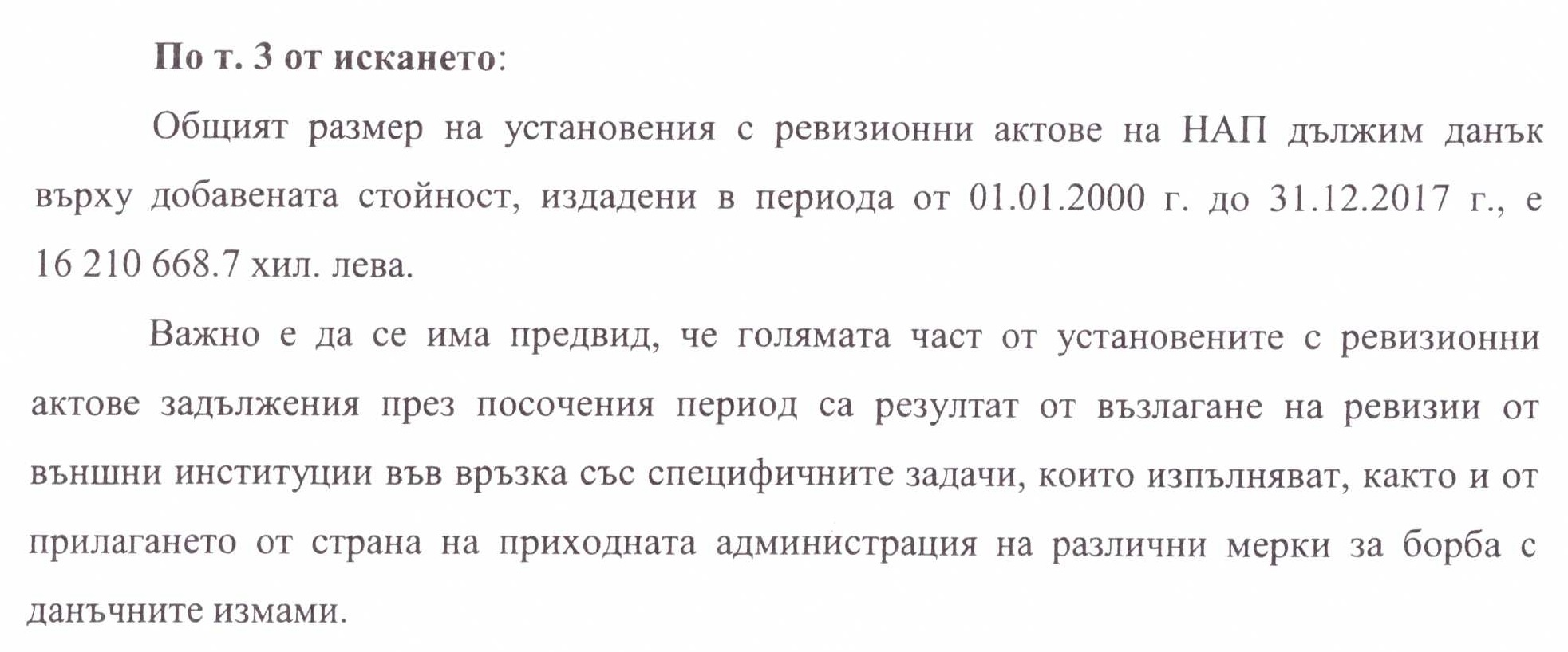 Освен това, 16 млрд. и 210 млн. лв. е общият размер на установения с ревизионни актове на НАП дължим данък върху добавената стойност, издадени в периода от 1.01.2000 г. до 31.12.2017 г. Това наистина е една огромна сума, огромна щета за бюджета на държавата.