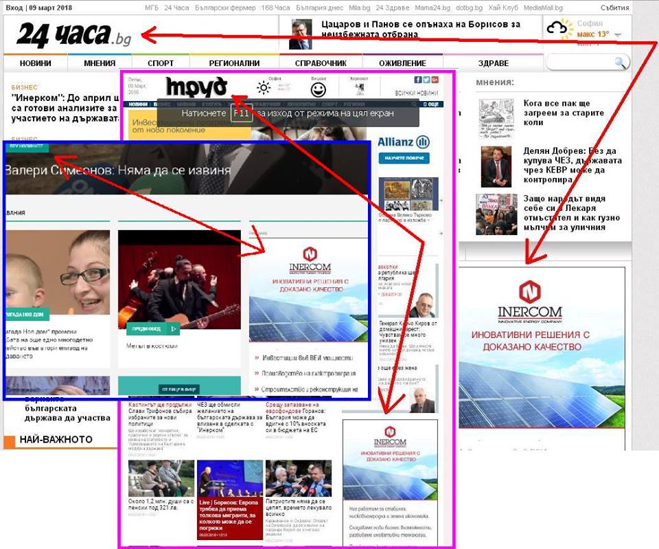 Банери на „Инерком“ заляха и редица новинарски сайтове. Те са директно програмирани в тях, а не се появяват през програматик-система. Т.е., контактите им с Гинчето са преки, а не опосредстени.