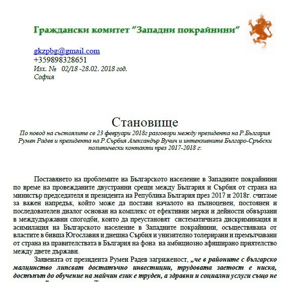 Именно поради това призоваваме официалните български власти в лицето на президента, министър-председателя, министрите и ръководителите на други български институции да не се задоволяват само с декларации и публично афиширани фрагментарни ангажименти при поредни преговори от сръбска страна за решаване проблемите на българското национално малцинство.