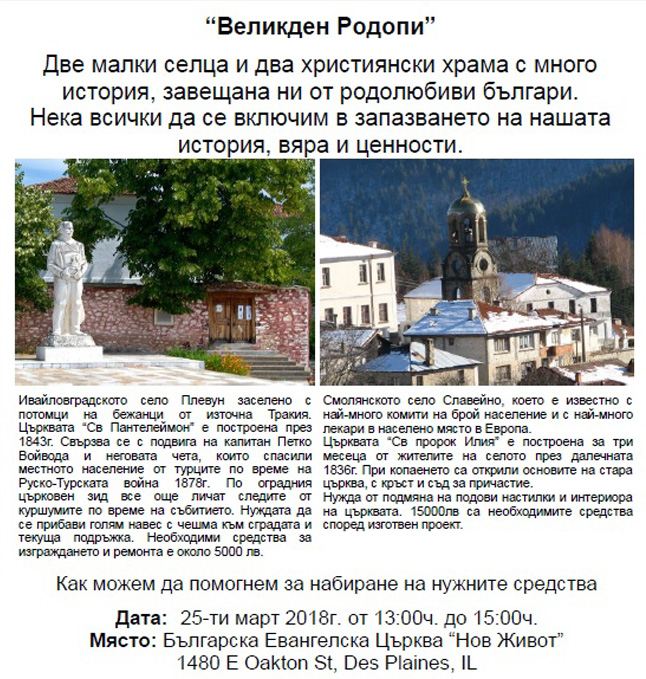 Благодарение на пасторите от евангелистката църква „Нов живот“ в Чикаго, които организираха великденски търг в неделя, на Благовещение, в присъствието и на ген. консул Иван Анчев, са били събрани $5000 само за един ден от търг на кулинарни произведения и картини. Средствата са предназначени за двете църкви – в с. Плевун, Ивайловградско, и в с. Славейно, Смолянско.