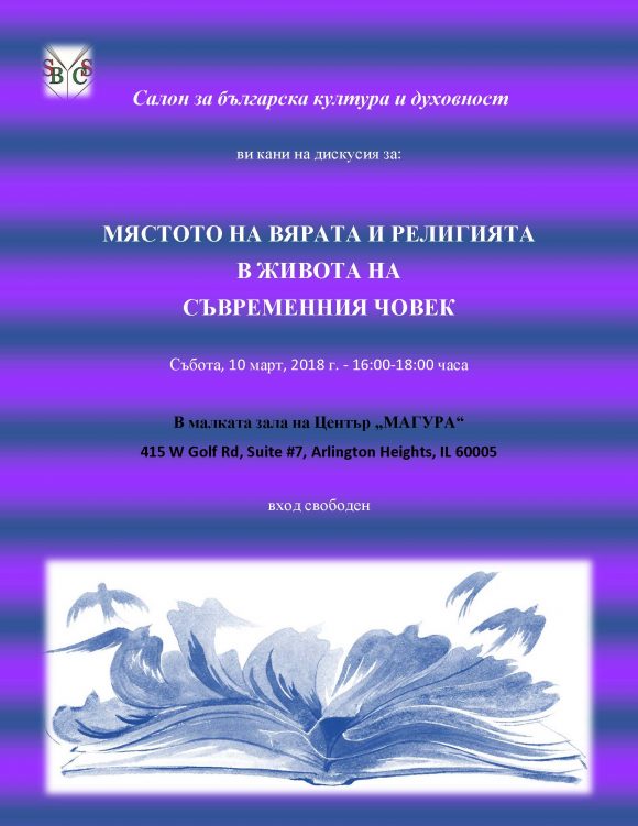 Салон за българска култура и духовност – Чикаго организира среща, на която ще се дискутира темата за мястото на вярата и религията в живота на съвременния човек. Макар и да живеем във време на материална презадоволеност и технически напредък, все по-често разбираме, че и нещо друго не ни достига, за да се радваме пълноценно на дните си. Какво е то? Как и къде да го открием? Когато достигнем до отговора на тези въпроси, ще разберем, че то зависи единствено и само от нас самите. Да се обърнем навътре към себе си и да го потърсим в нашето сърце. Тогава можем да усетим Светлината, Доброто, Истината, Любовта.