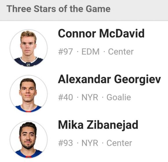 Според специалистите в хокея и любителите на красивата игра, най-голяма заслуга за победата има чудесно игралият вратар на гостите Александър Георгиев. Той постигна отличен резултат при спасяванията, като опази вратата си при 35 удара от 37 и постигна резултат 0,946. Георгиев (на снимката долу) опази вратата си суха през първата и през тежката за отбора му трета третина. Eдни от най-срещаните заглавия в медиите са: „Rangers’ Georgiev beats Oilers, wins 1st“, „Aleksandar Georgiev lifts Rangers past Oilers, earns first NHL win“ и „Georgiev gets 1st NHL win, resurgent Rangers beat Oilers 3-2„.