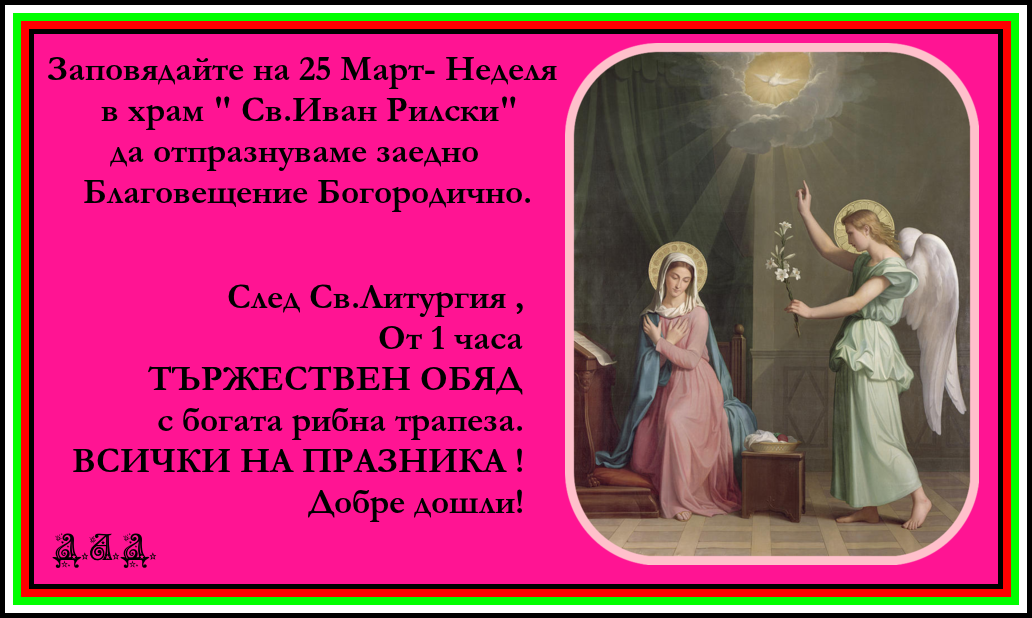 На 25 март, неделя, на Благовещение Богородично, в храма „Св. Иван Рилски Чудотворец“ в Чигаго ще има празнична Света литургия от 10.30 часа. След литургията, от 1 часа следобед, ще има и тържествен обяд с рибна трапеза.