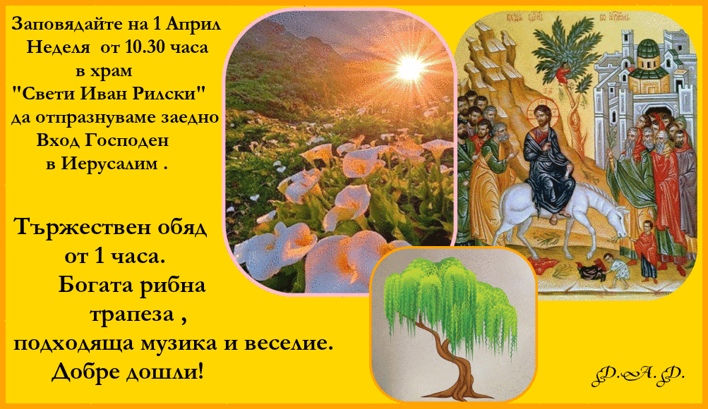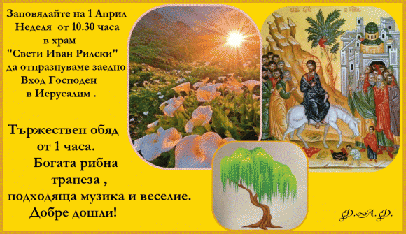 Поканват се всички желаещи вярващи православни сънародници на Светата литургия и на тържеството за празника Цветница след това.