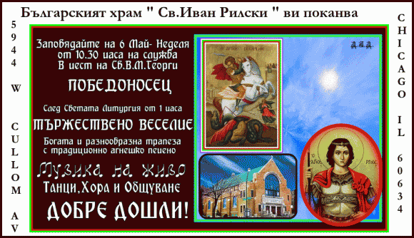 На 6 май, неделя, в деня на Свети Георги Победоносец, празничната Света Литургия в храма „Св. Иван Рилски Чудотворец“ в Чикаго ще започне от 10.30 часа. След това, от 1 ч. следобед, ще има тържество, с богата трапеза, музика на живо, танци и веселие.