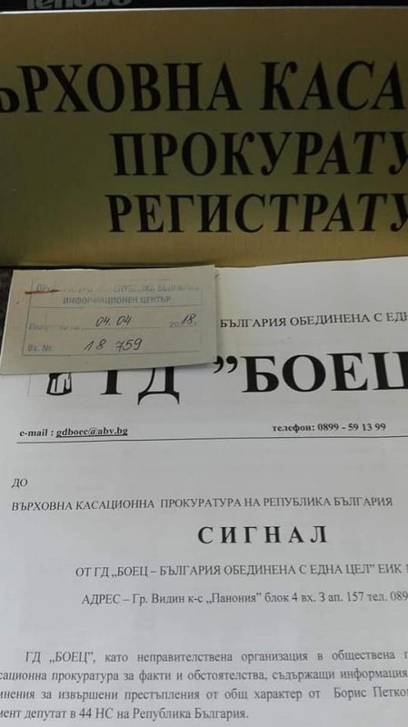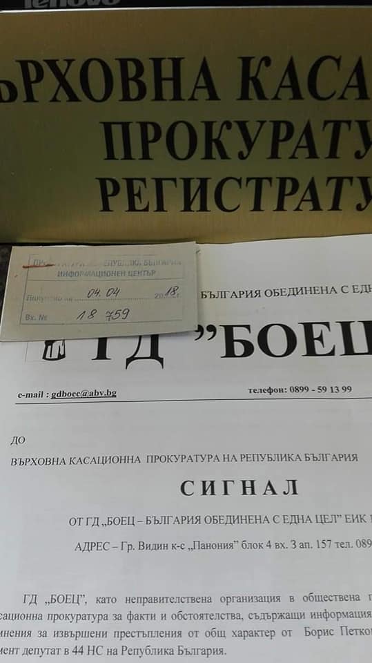 Гражданско движение „БОЕЦ“ внесе днес сигнал във Върховна касационна прокуратура срещу депутата от ГЕРБ Борис Кърчев, за участие в схема за прехвърляне на фирма със задължения на малоимотен гражданин. От гражданското движение са сезирали прокуратурата за факти и обстоятелства, огласени в материали на PRESS TV и други медии, в които се излага информация, будеща съмнения за данъчни, документни и финансови престъпления, извършени от Кърчев, довели до щети за бюджета за стотици хиляди левове.