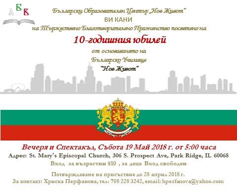 Български образователен център „Нов Живот“ ще чества 10 години от основаването на Българско училище „Нов Живот“ с тържествено, благотворително празненство. 10-годишният юбилей ще бъде отпразнуван с вечеря и спектакъл на 19 май 2018 г., събота, от 5 pm в епископалната църква „Св. Мария“.