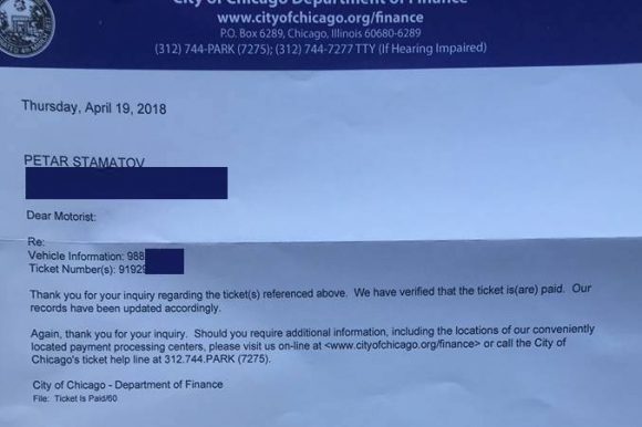 Този въпрос си задавам и днес, след като след моето поредно посещение в Чикаго получих ново писмо и нов тикет с глоба от $60. Ето снимка на част от това писмо до мен.