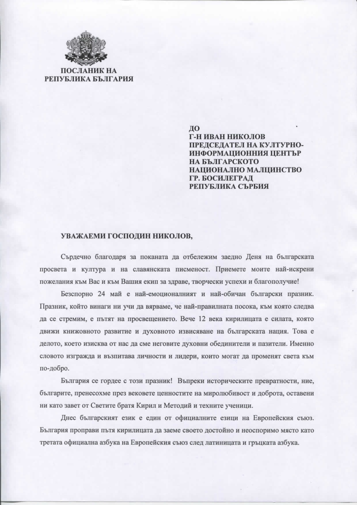 Бяха прочетени поздравителни писма от посланика на Р. България в Р. Сърбия, Н.П. г-н Радко Влайков, и на председателя на Държавната агенция за българите в чужбина г-н Петър Харалампиев. Поздравителни слова изнесоха Иван Николов, председател на Културно-информационен център „Босилеград“; Николай Колев, пълномощен министър при Генералното консулство на Р. България в Ниш; д-р Валентин Янев, съпредседател на Граждански комитет „Западни покрайнини“.