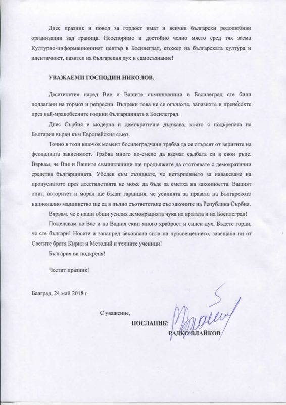 Когато преди 15 години за КИЦ „Босилеград“ със своите верни съратници проф. Лозан Митев, д-р Валентин Янев, Столична община и много други и за първи път започнахме символично да отбелязваме Деня на Българската просвета и култура в Извор, срещнахме невероятна съпротива от Сръбската православна църква, крайните националисти и комунистите. Въпреки това, ние продължихме да отбелязваме Празника на буквите, и с това провокирахме едни, макар и плахи опити, празникът да се отбелязва и в босилеградските училища. Отбелязването на този празник все още не се прави, както трябва, и това наистина е проблем.
