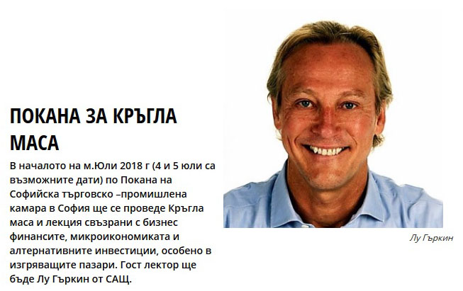 В началото на м. юли 2018 г. (4-ти и 5-ти юли са възможните дати), по покана на Софийската търговско-промишлена камара, в София ще се проведе Кръгла маса и лекция, свъзрани с бизнес финансите, микроикономиката и алтернативните инвестиции, особено в изгряващите пазари. Гост лектор ще бъде Лу Гъркин от САЩ, авторитет в областта на бизнес финансите, микроикономиката и алтернативните инвестиции. Лекцията се организира със съдействието на проф. Димитър Иванов. Желаещите могат да се регистрират се за участие със съобщение на имейл адрес [email protected] .