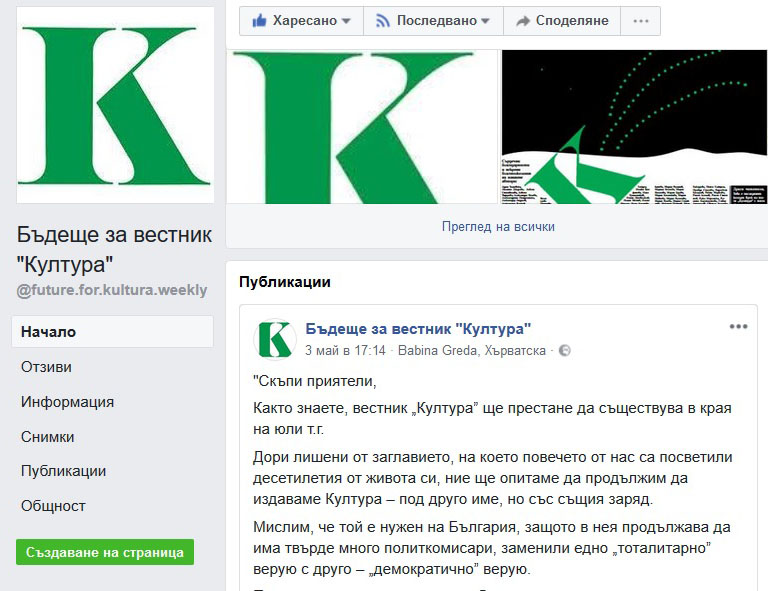 В социалната мрежа Фейсбук е създадена група с название „Бъдеще за вестник „Култура“. В нея е публикуван един текст, подписан от редакционния екип, който вече бе публикуван и в самия вестник. Ето какво гласи той: