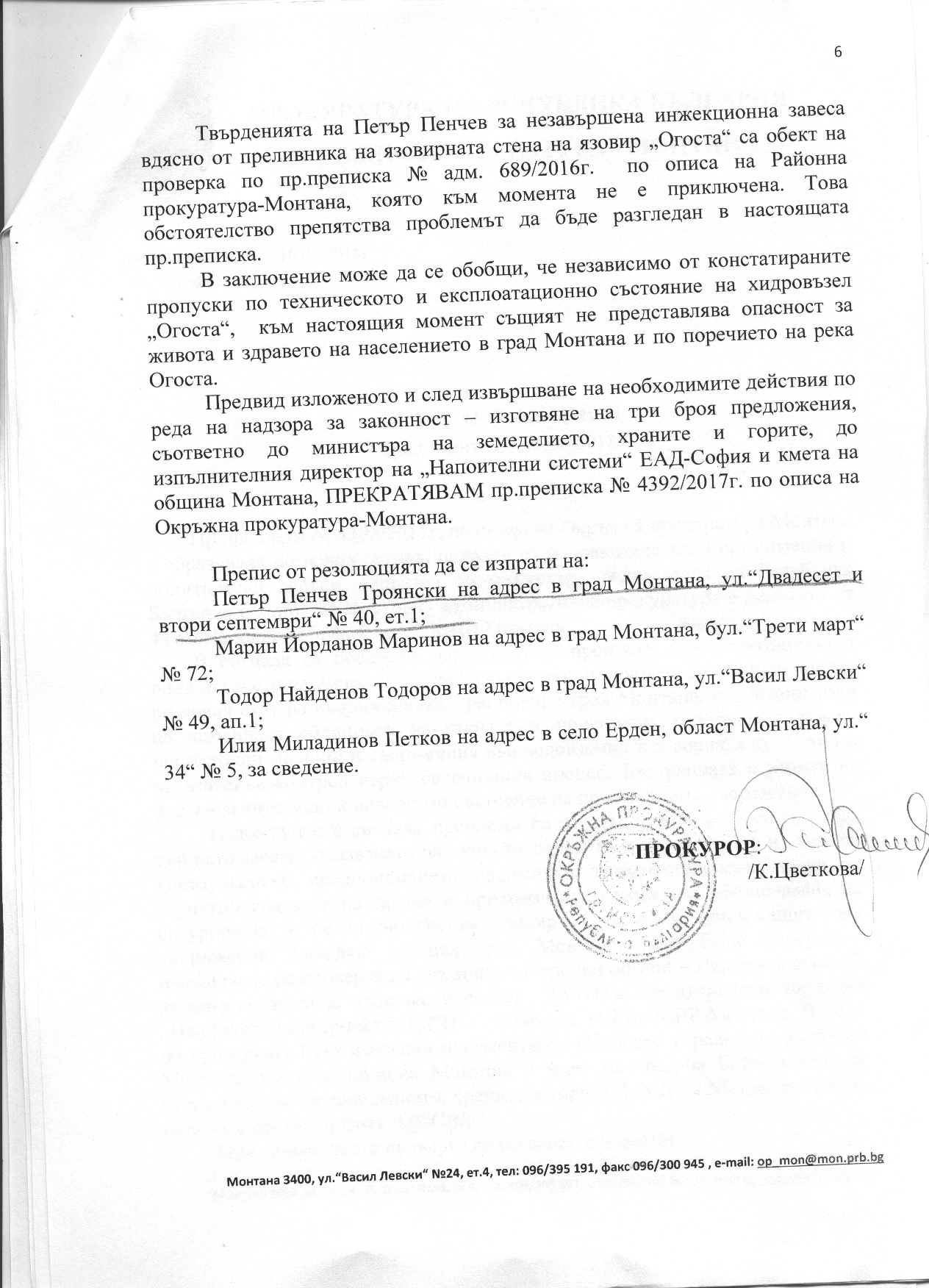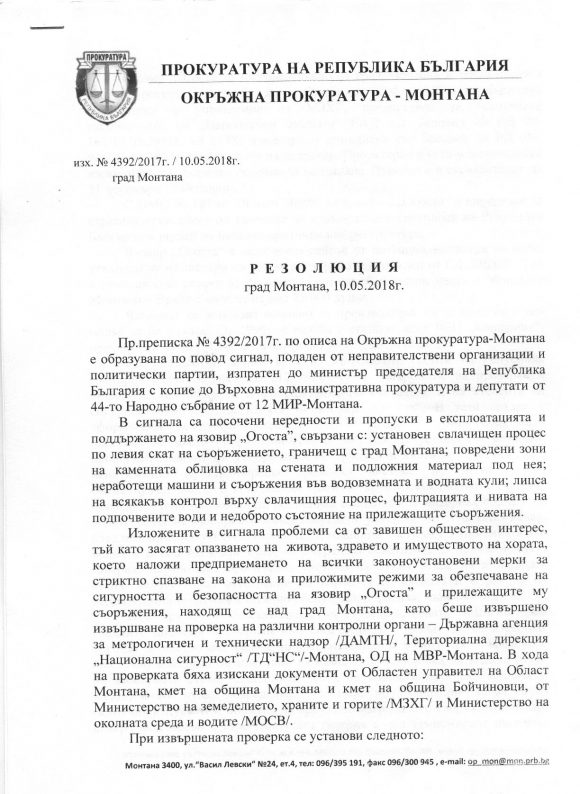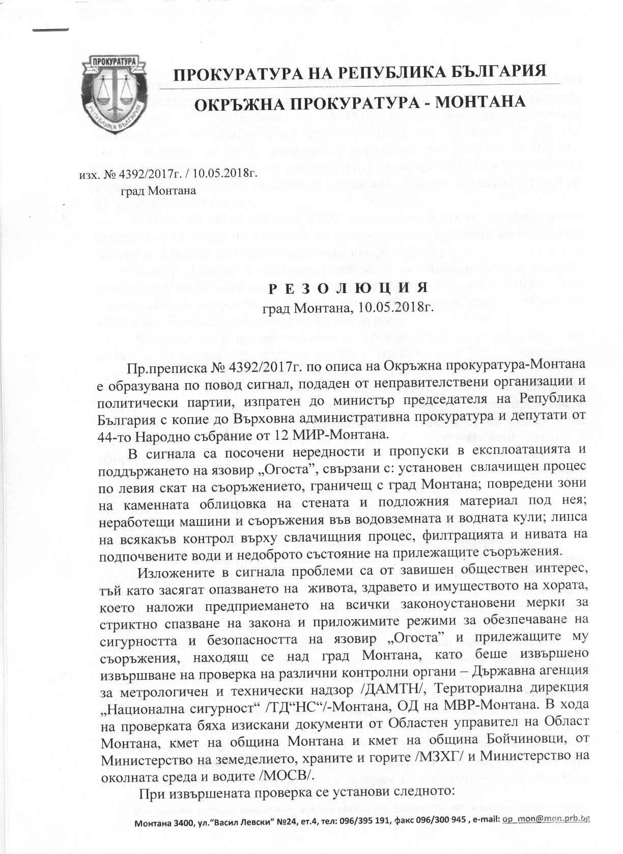Резолюция на Окръжна прокуратура – Монтана, изх. № 4392/2017 г./ 10.05.2018 г.