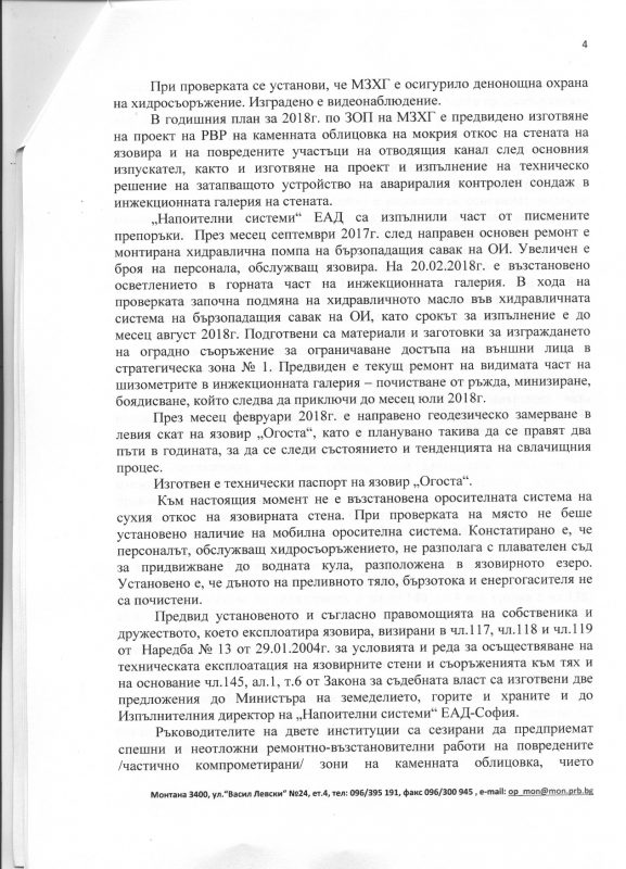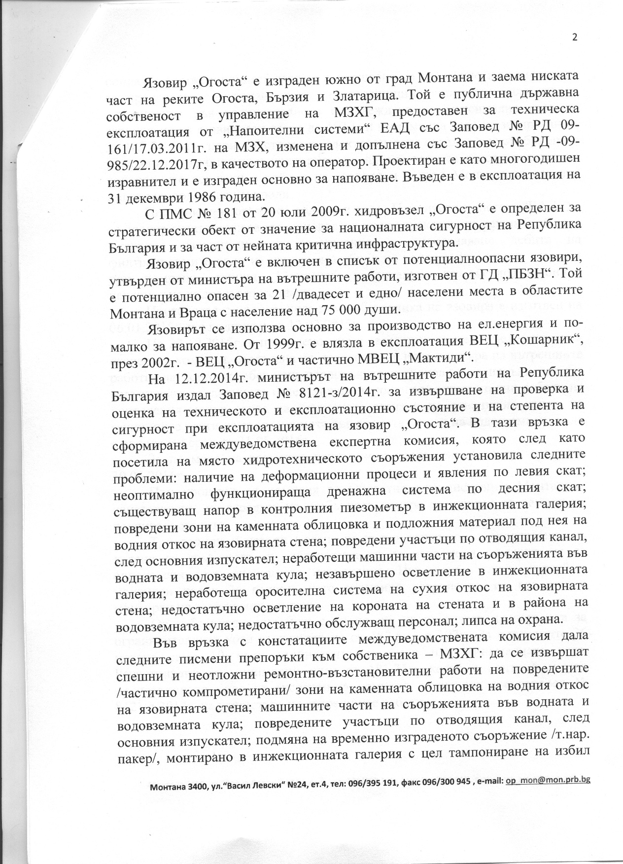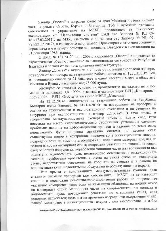 „Окръжна прокуратура – Монтана е внесла предложение до МЗХ за предприемане на мерки във връзка с констатирано опасно състояние на язовир Огоста. Преписката в ОП – Монтана е образувана по повод сигнал, подаден от неправителствени организации и политически партии, в който са посочени нередности и пропуски в експлоатацията и поддържането на язовира, свързани с установен свлачищен процес по левия скат на съоръжението, граничещ с град Монтана; повредени зони на каменната облицовка на стената и други.