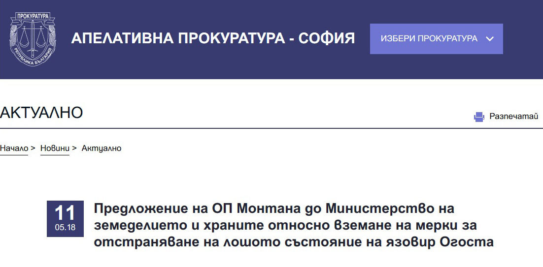 В сайта на Апелативна прокуратура – София е публикувано Предложение на Окръжна прокуратура – Монтана до Министерство на земеделието и храните, относно вземане на мерки за отстраняване на лошото състояние на язовир „Огоста“.