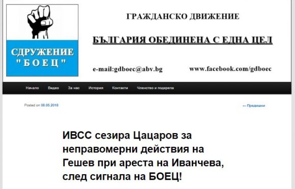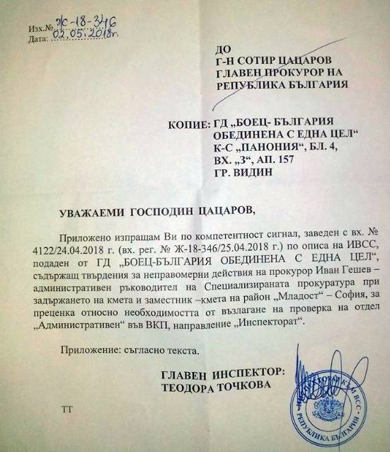 В редакцията получихме материал от Гражданско движение „БОЕЦ“, във връзка с внесен сигнал от „БОЕЦ“ до Инспектората на Висшия съдебен съвет, Министерството на правосъдието и Парламента, за неправомерни действия при ареста на кмета на район „Младост“ Десислава Иванчева и зам.-кмета Биляна Петрова. Инспекторатът на ВСС, вместо да образува проверка по сигнала на „БОЕЦ“, е препратил сигнала до главния прокурор Сотир Цацаров.