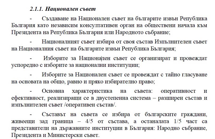– Създаване на Национален съвет на българите извън Република България като независим консултативен орган на обществени начала към Президента на Република България или Народното събрание;