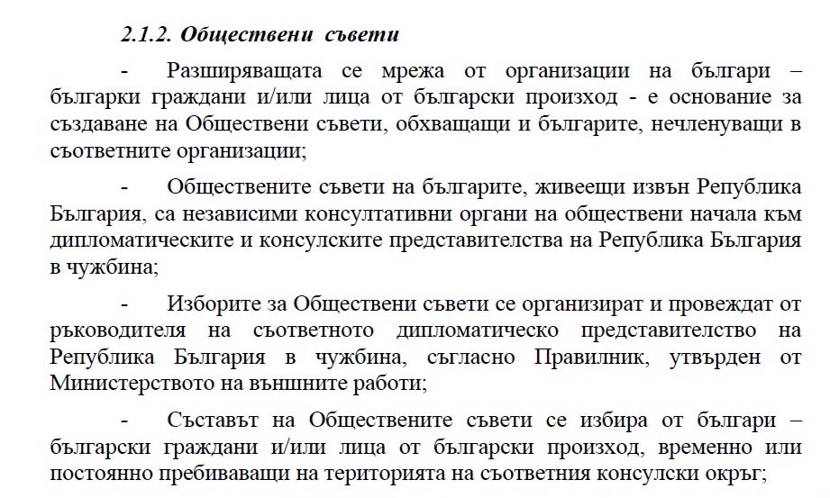 – Обществените съвети на българите, живеещи извън Република България, са независими консултативни органи на обществени начала към дипломатическите и консулските представителства на Република България в чужбина;