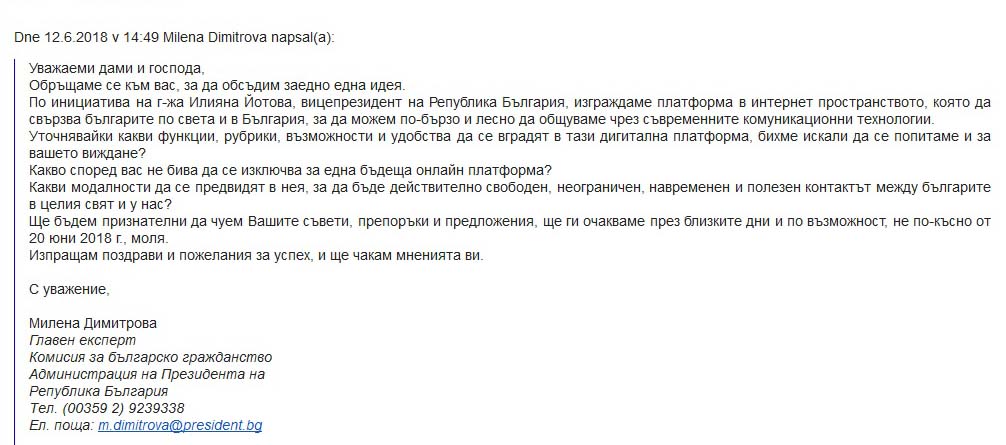Съобщението е изпратено и подписано от Милена Димитрова, главен експерт в Комисията за българско гражданство към Президентството.