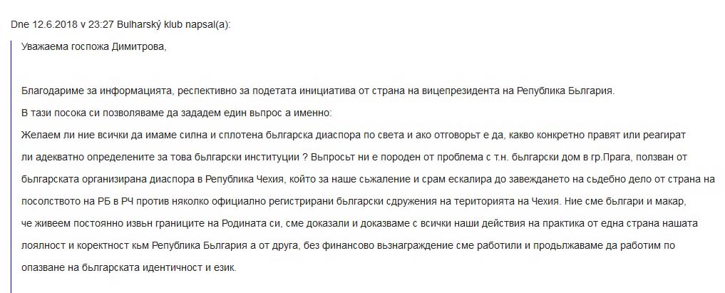 Един от адресатите на това съобщение, Асоциацията на българските сдружения в Република Чехия, е върнал вече отговор на г-жа Милена Димитрова. В отговора, подписан от г-н Кирил Беровски, председател на Асоциацията на бьлгарските сдружения в Република Чехия, се казва: