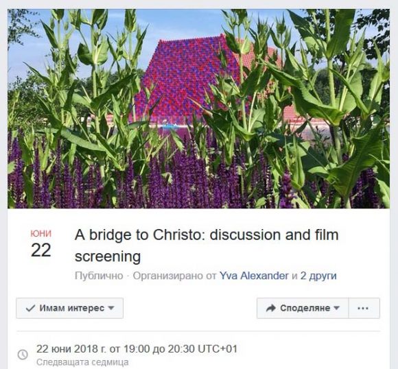 Организаторите канят всички желаещи да се присъединят се към тях за филмовия скрининг и откритата дискусия за Кристо и първия му проект в Лондон – „A bridge to Christo: discussion and film screening“.