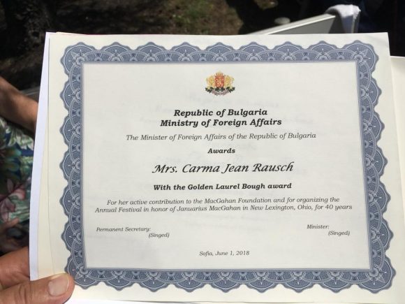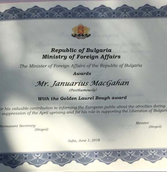 След това българският посланик обяви, че Джанюариъс Макгахан е отличен посмъртно с най-високото отличие на Министерството на външните работи – “Златна лаврова клонка”, за неговата подкрепа за Освобождението на България.