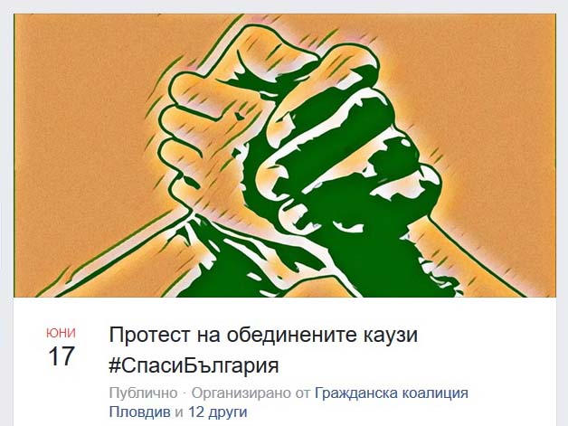 „Общности, създадени в социалната мрежа, по повод различни казуси, организираме на 17 юни, World Day to Combat Desertification and Drought, първия общ протест на обединените каузи #СпасиБългария. Обединяваме се, за да докажем, че в България има гражданско общество и то не е безразлично към случващото се. Знаем, че „една птичка пролет не прави“ и само сплотени, като Кубратовия сноп пръчки, сме силни. С раково образувание не можеш да се бориш „на парче“, лекувайки симптомите, а се отстранява целия тумор. И единението ни не е защото на фасадата на Народното събрание стои паметната фраза „Съединението прави силата“, опорочена от ползването й като мото на българското европредседателство, а защото вярваме в народната мъдрост „Сговорна дружина, планина повдига“. Ако и ти вярваш в нея, ела на протеста! Не за да се молим за нещо на това правителство и парламента му, а за да изискаме и да наложим волята си над тези, на които плащаме заплатите. Нека потърсим отговорност заедно!