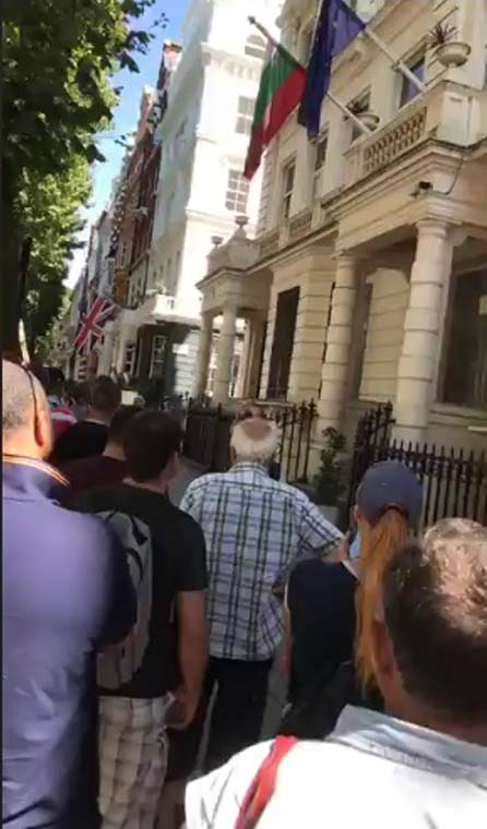 Днес в Лондон наши сънародници се събраха пред Българското посолство, на протест „срещу геноцида на българския народ през последните 30 години“, както бе обявен самият протест. Той бе организиран от Фейсбук група „Против геноцида на Борисов и всички досегашни управляващи мафии“. Протестът беше обявен в тази ФБ група като „НАЦИОНАЛЕН ПРОТЕСТ СРЕЩУ ГЕНОЦИДА ВЪРХУ БЪЛГАРСКИЯ НАРОД ПРЕЗ ПОСЛЕДНИТЕ 30 г., юли 2018 г., в БЪЛГАРИЯ И ВСИЧКИ ЕВРОПЕЙСКИ СТОЛИЦИ“.