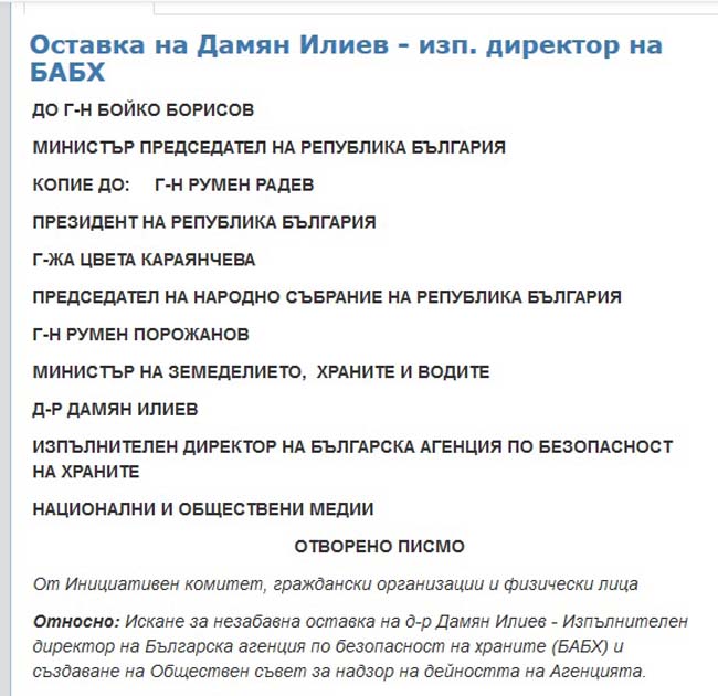 Граждани инициираха Отворено писмо и петиция с искане за оставката на д-р Дамян Илиев, изпълнителен директор на Българска агенция по безопасност на храните (БАБХ), и създаване на Обществен съвет за надзор на дейността на БАБХ. Отвореното писмо е изпратено вчера до премиера Бойко Борисов, Румен Радев, Цвета Караянчева, Румен Порожанов и самия Дамян Илиев.