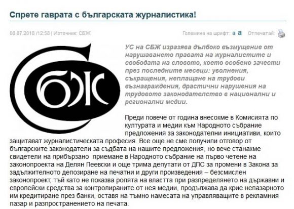 Съюзът на българските журналисти публикува на сайта си позиция, с която се изразява дълбоко възмущение от нарушаването правата на журналистите и на свободата на словото. Позицията е свързана със законопроекта за медиите на Делян Пеевски, който СБЖ нарича безсмислен законопроект, „тъй като не показва ролята на властта при разпределянето на държавни и европейски средства за контролираните от нея медии, продължава да крие непазарното им кредитиране през банки, оставя на тъмно намесата на управляващите в рекламния пазар и разпространението на печата“. Следва целият текст на позицията на СБЖ, подписана от Управителния съвет на съюза.