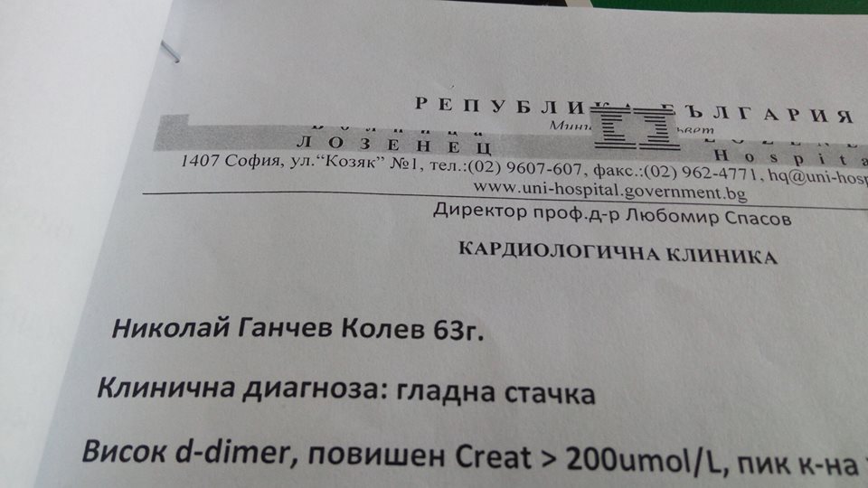 Чета тук-там, че вървят спекулации относно състоянието му след месец и половина глад. Виждам го често и мога да кажа, че картината не е за хора със слаби сърца. Сърцето и белите му дробове са добре за човек в неговото състояние. Макар че има перикардит, не се задъхва. Бъбреците му са много зле. Той самият има известни познания по физиология и органи на човешкото тяло, и е наясно с това. Най-малкото по причина, че през последните дни леко увеличава собственото си тегло. Причината е, че отделя едва по около 100 мл на ден като урина. Останалото количество вода – литър и нагоре, не се преработва. Това е лошо. Дори много лошо.
