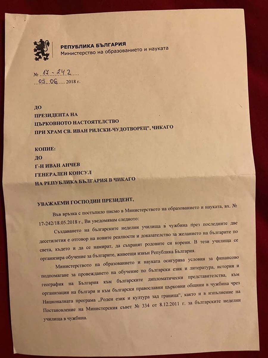 Следва още един документ по темата. Това е писмо на българския генерален консул в Чикаго Иван Анчев до председателя на църковното настоятелство Георги Флеминг и до свещеника на храма отец Димитър, изпратено на 19 юни т.г. С това писмо г-н Анчев уведомява г-н Флеминг и отец Димитър, че субсидията за българското училище към храма вече ще се изплаща чрез Генералното консулство, както и, че църковното настоятелство трябва да върне на училището сумата от $ 2564.36.
