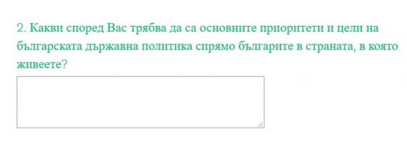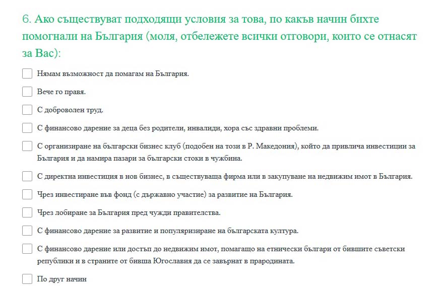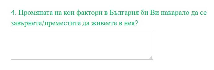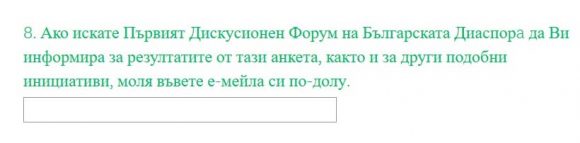 Анкетата е отворена и ще продължава да бъде отворена за попълване от всички наши сънародници по света, както и от завърнали се в България емигранти до късната есен вероятно. При нейното попълване не се изискват лични данни. И колкото повече емигранти и българи от т.нар. историческа диаспора попълнят тази анкета, толкова по-ясна ще бъде очертаната картина за възможните цели, идеи и инициативи, около които биха се обединили повече хора.