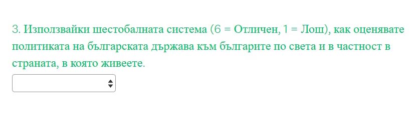 На въпроса „Използвайки шестобалната система, как оценявате политиката на българската държава към българите по света и в частност в страната, в която живеете“, 19 от анкетираните са отговорили, че нямат база за оценка. Останалите (122) са дали на българското правителство средна оценка 2,5 по шестобалната система.